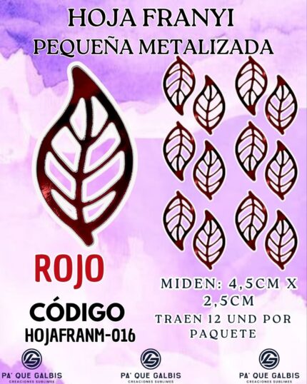 HOJAS PEQUEÑAS FRANYI ROJO METALIZADAS 1 PAQUETE CONTIENE 12 UND CÓDIGO HOJAFRANM-016
