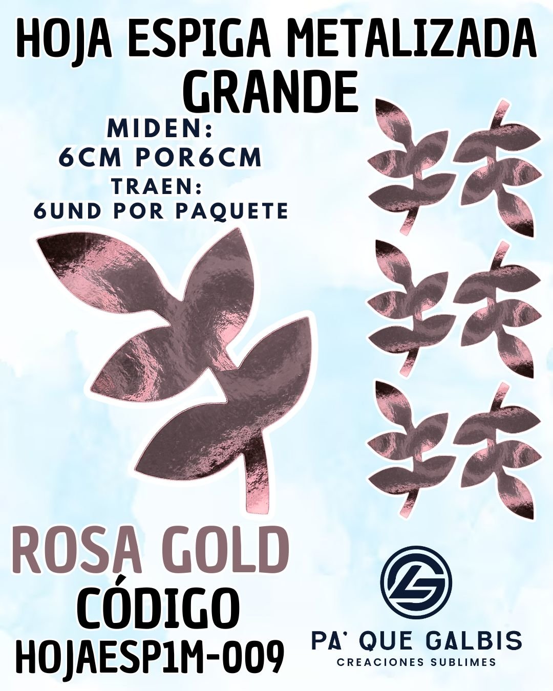 HOJAS GRANDES ESPIGA ROSA GOLD METALIZADAS 1 PAQUETE CONTIENE 6 UND CÓDIGO HOJAESP1M-009