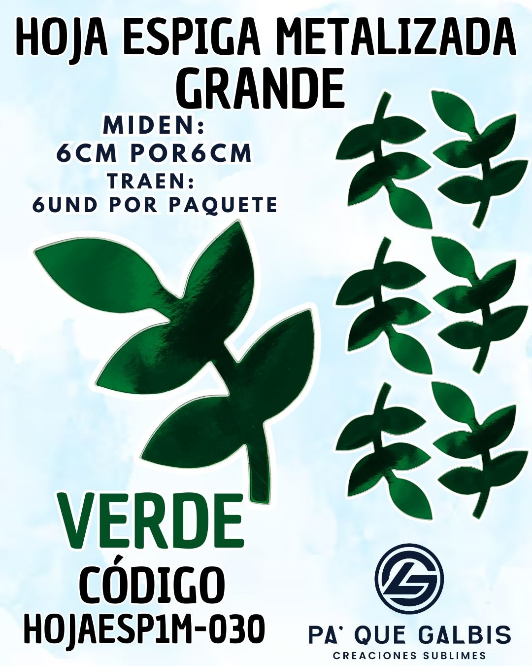 HOJAS GRANDES ESPIGA VERDE METALIZADAS 1 PAQUETE CONTIENE 6 UND CÓDIGO HOJAESP1M-030