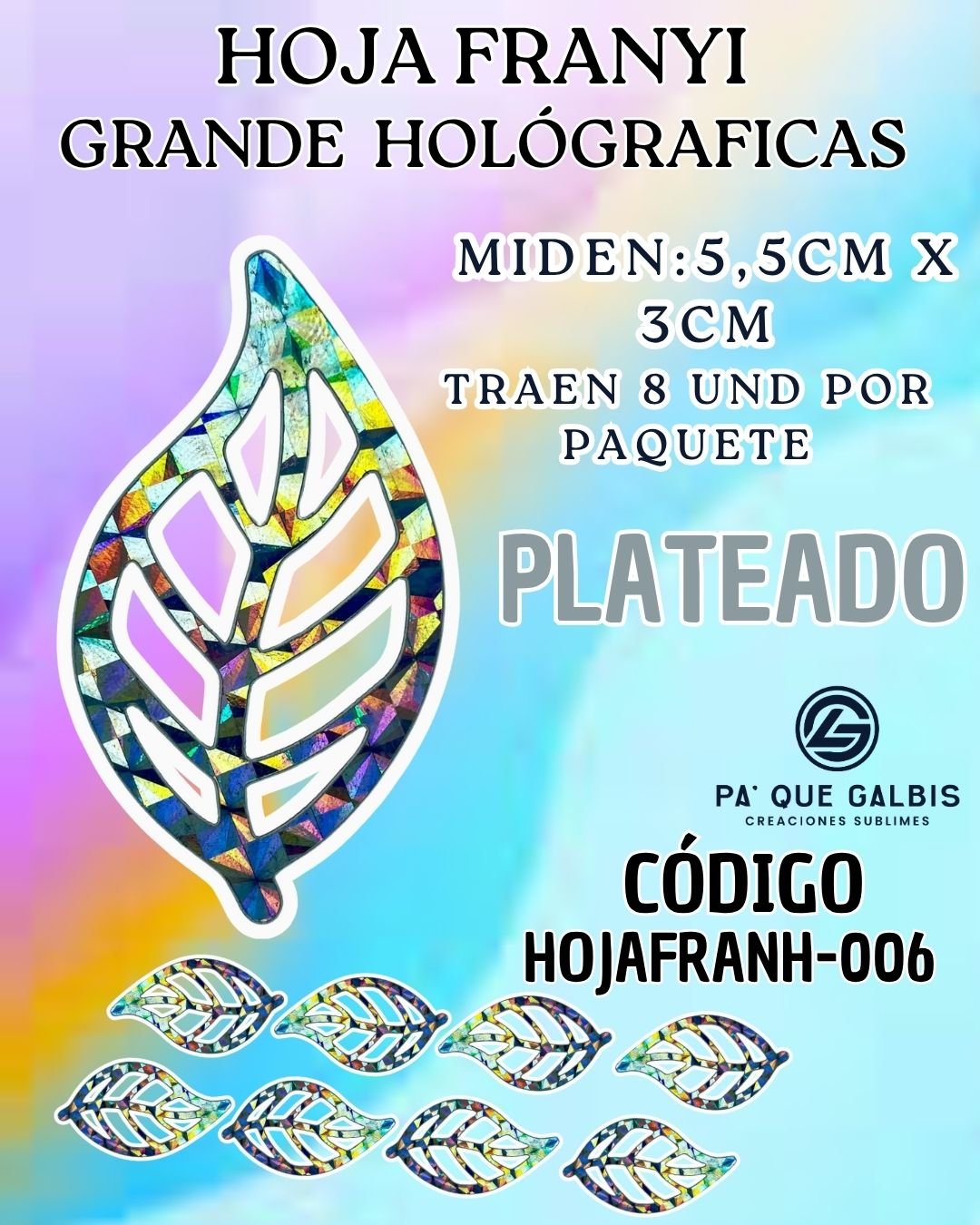 HOJAS GRANDES FRANYI PLATEADO HOLOGRÁFICAS 1 PAQUETE CONTIENE 8 UND CÓDIGO HOJAFRANH-006