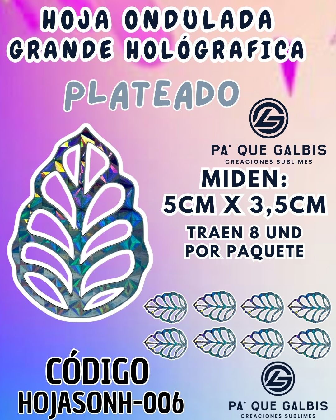 HOJAS GRANDES ONDULADA PLATEADO HOLOGRÁFICAS 1 PAQUETE CONTIENE 8 UND CÓDIGO HOJASONH-006