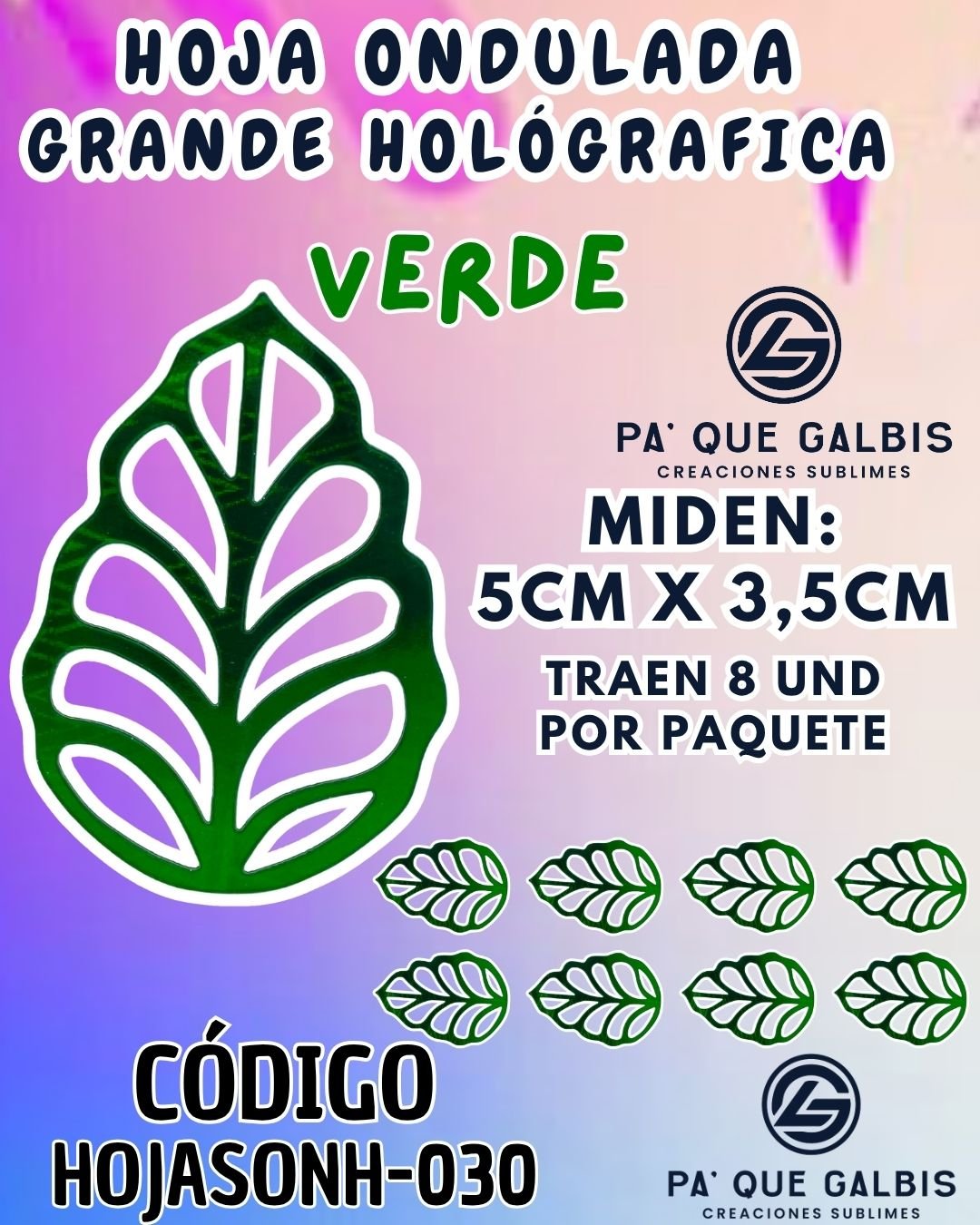 HOJAS GRANDES ONDULADA VERDE HOLOGRÁFICAS 1 PAQUETE CONTIENE 8 UND CÓDIGO HOJASONH-030