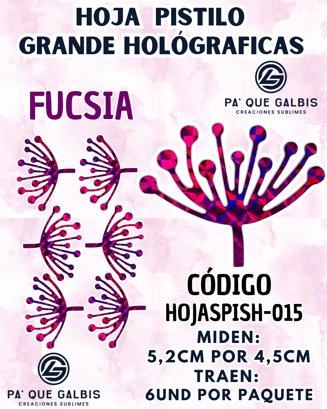 HOJAS GRANDES PISTILO FUCSIA HOLOGRÁFICAS 1 PAQUETE CONTIENE 6 UND CÓDIGO HOJASPISH-015