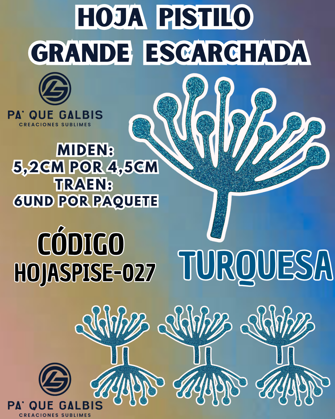HOJAS GRANDES PISTILO TURQUESA ESCARCHADAS 1 PAQUETE CONTIENE 6 UND CÓDIGO HOJASPISE-027