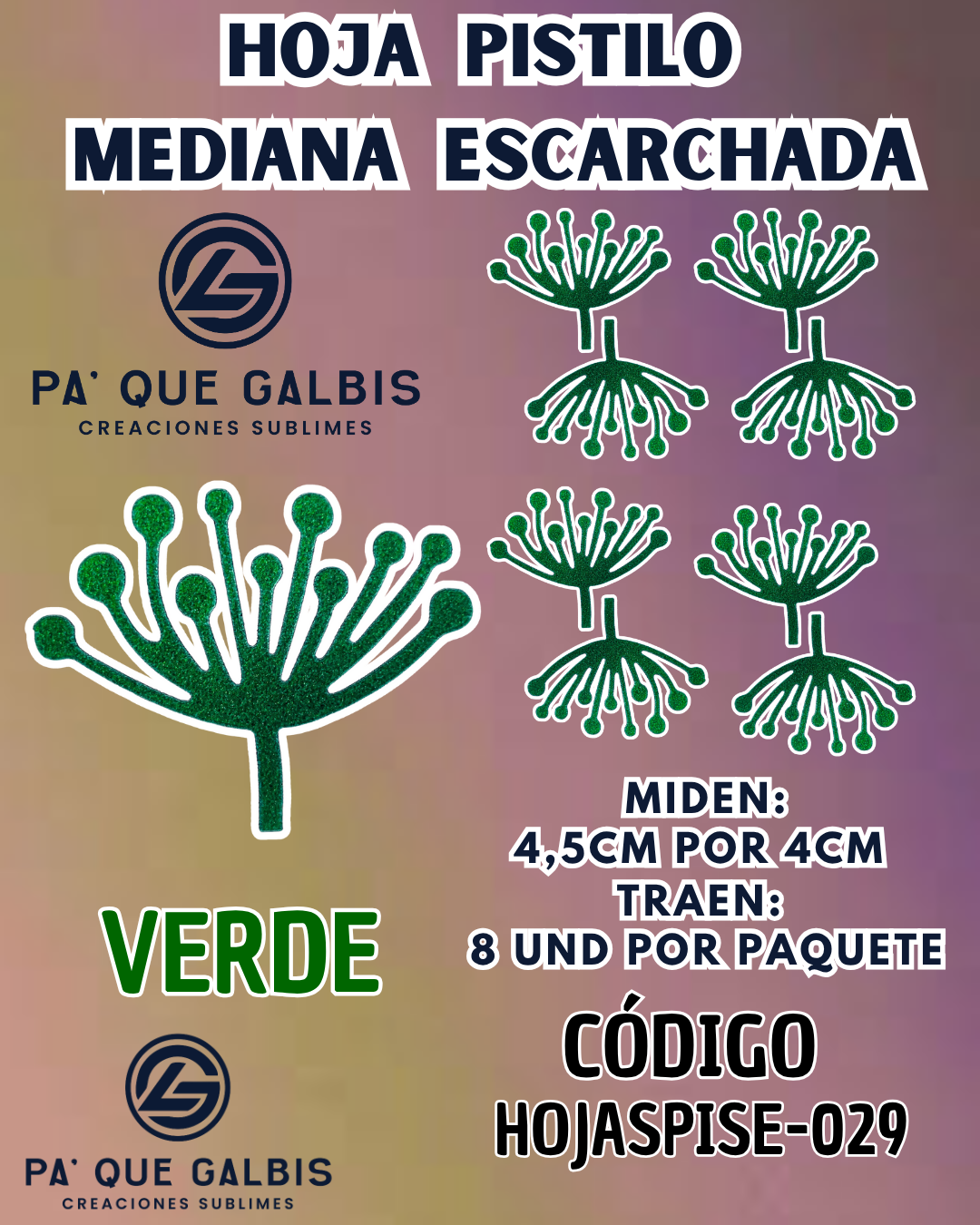 HOJAS MEDIANAS PISTILO VERDE ESCARCHADAS 1 PAQUETE CONTIENE 8 UND CÓDIGO HOJASPISE-029