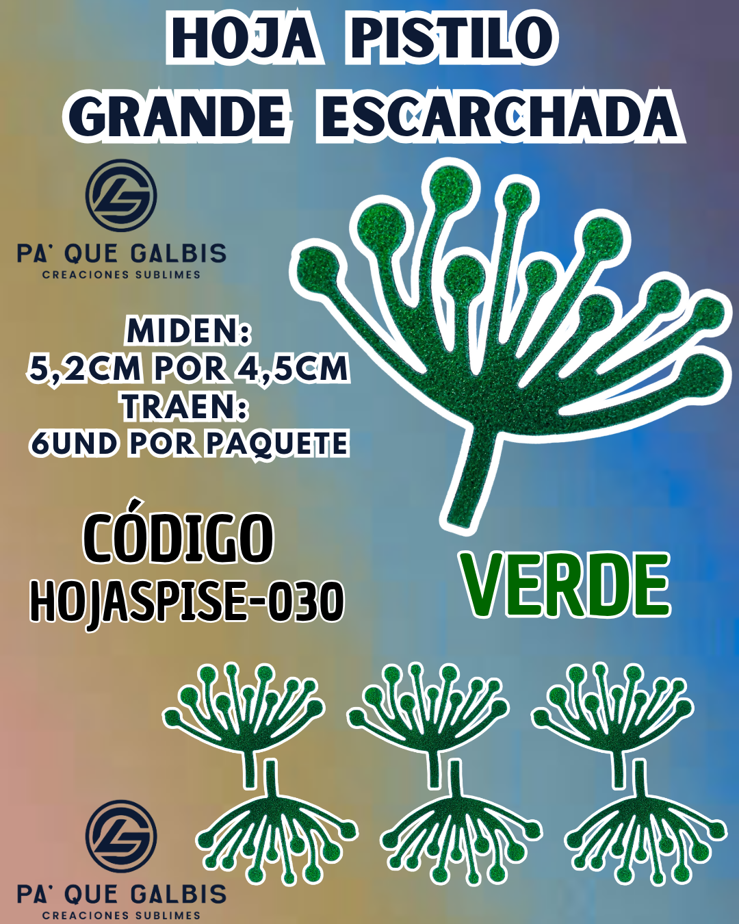 HOJAS GRANDES PISTILO VERDE ESCARCHADAS 1 PAQUETE CONTIENE 6 UND CÓDIGO HOJASPISE-030