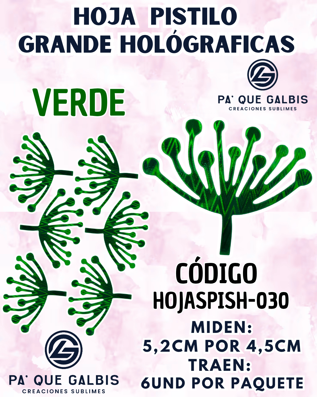 HOJAS GRANDES PISTILO VERDES HOLOGRÁFICAS 1 PAQUETE CONTIENE 6 UND CÓDIGO HOJASPISH-030
