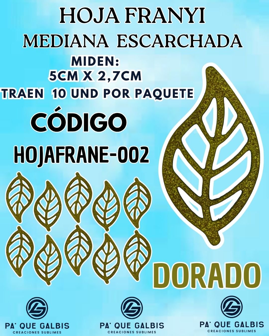 HOJAS MEDIANAS FRANYI DORADO ESCARCHADAS 1 PAQUETE CONTIENE 10 UND CÓDIGO HOJAFRANE-002