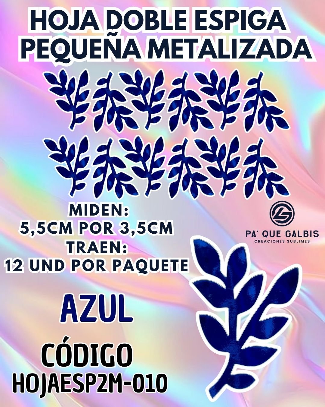 HOJAS PEQUEÑAS DOBLE ESPIGA AZUL METALIZADAS 1 PAQUETE CONTIENE 12 UND CÓDIGO HOJAESP2M-010