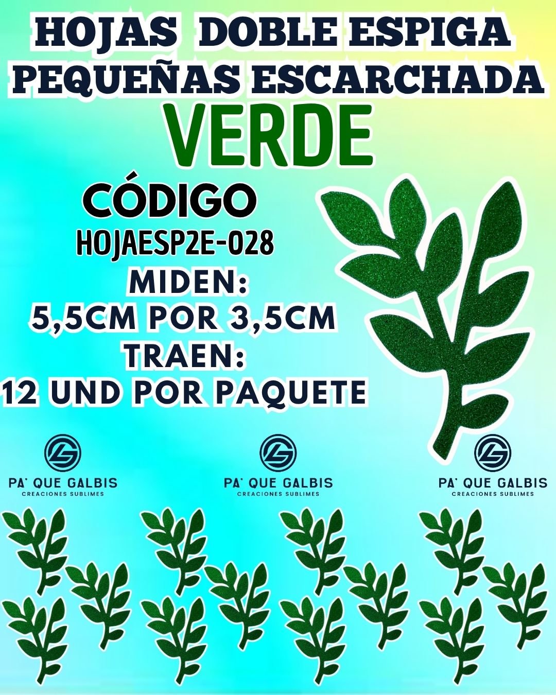 HOJAS PEQUEÑAS DOBLE ESPIGA VERDE ESCARCHADAS 1 PAQUETE CONTIENE 12 UND CÓDIGO HOJAESP2E-028