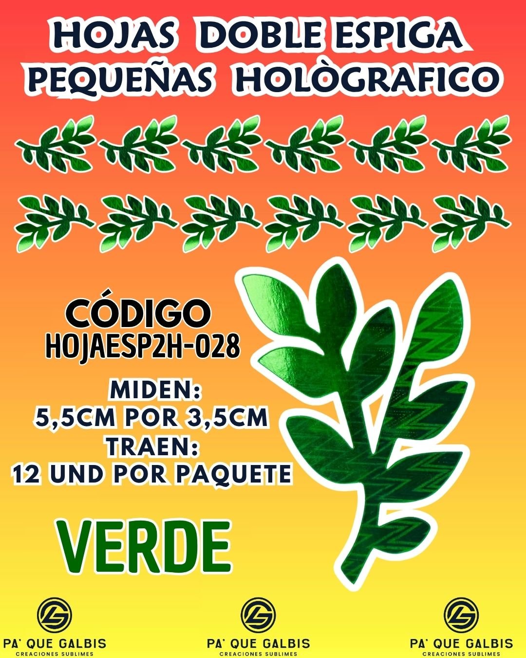 HOJAS PEQUEÑAS DOBLE ESPIGA VERDE HOLOGRÁFICAS 1 PAQUETE CONTIENE 12 UND CÓDIGO HOJAESP2H-028