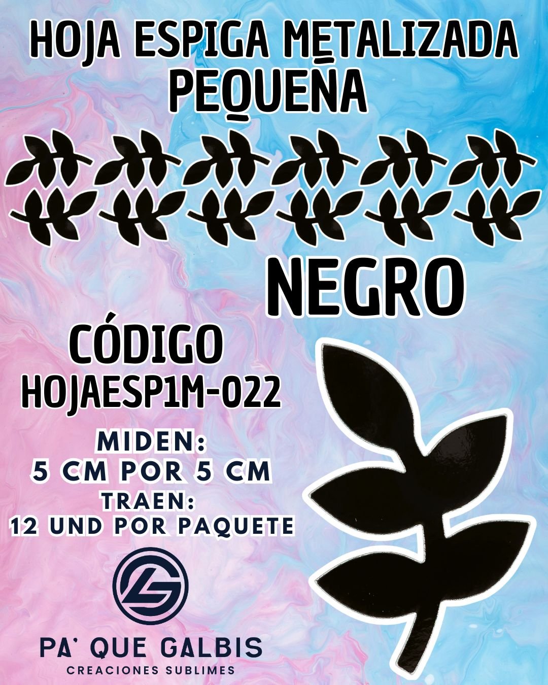 HOJAS PEQUEÑAS ESPIGA NEGRO METALIZADAS 1 PAQUETE CONTIENE 12 UND CÓDIGO HOJAESP1M-022
