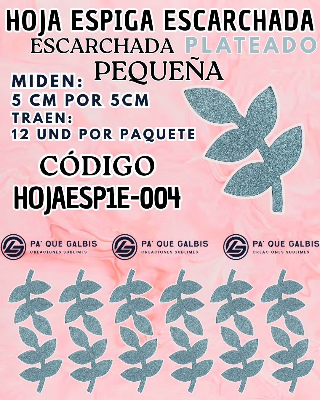 HOJAS PEQUEÑAS ESPIGA PLATEADO ESCARCHADAS 1 PAQUETE CONTIENE 12 UND CÓDIGO HOJAESP1M-004