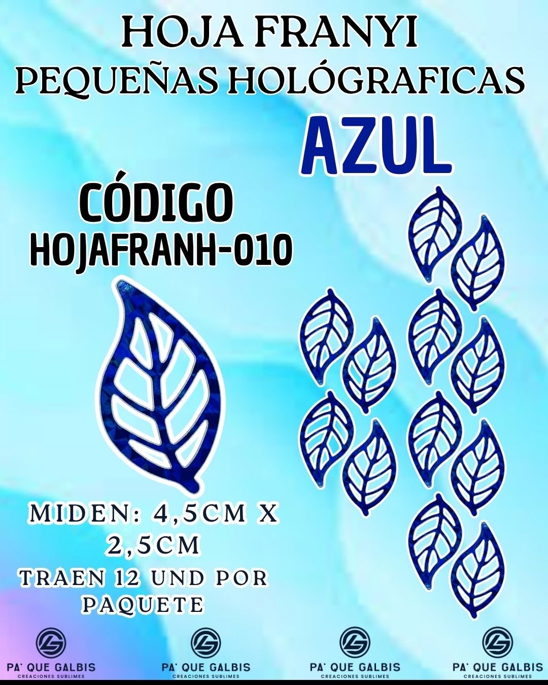 HOJAS PEQUEÑAS FRANYI AZUL HOLOGRÁFICAS 1 PAQUETE CONTIENE 12 UND CÓDIGO HOJAFRANH-010