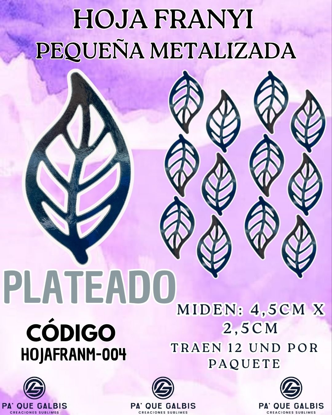 HOJAS PEQUEÑAS FRANYI PLATEADO METALIZADAS 1 PAQUETE CONTIENE 12 UND CÓDIGO HOJAFRANM-004