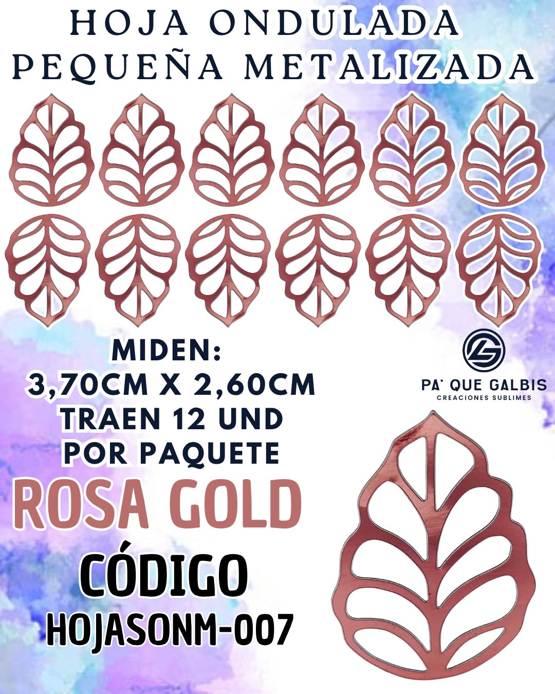 HOJAS PEQUEÑAS ONDULADA ROSA GOLD METALIZADAS 1 PAQUETE CONTIENE 12 UND CÓDIGO HOJASONM-007