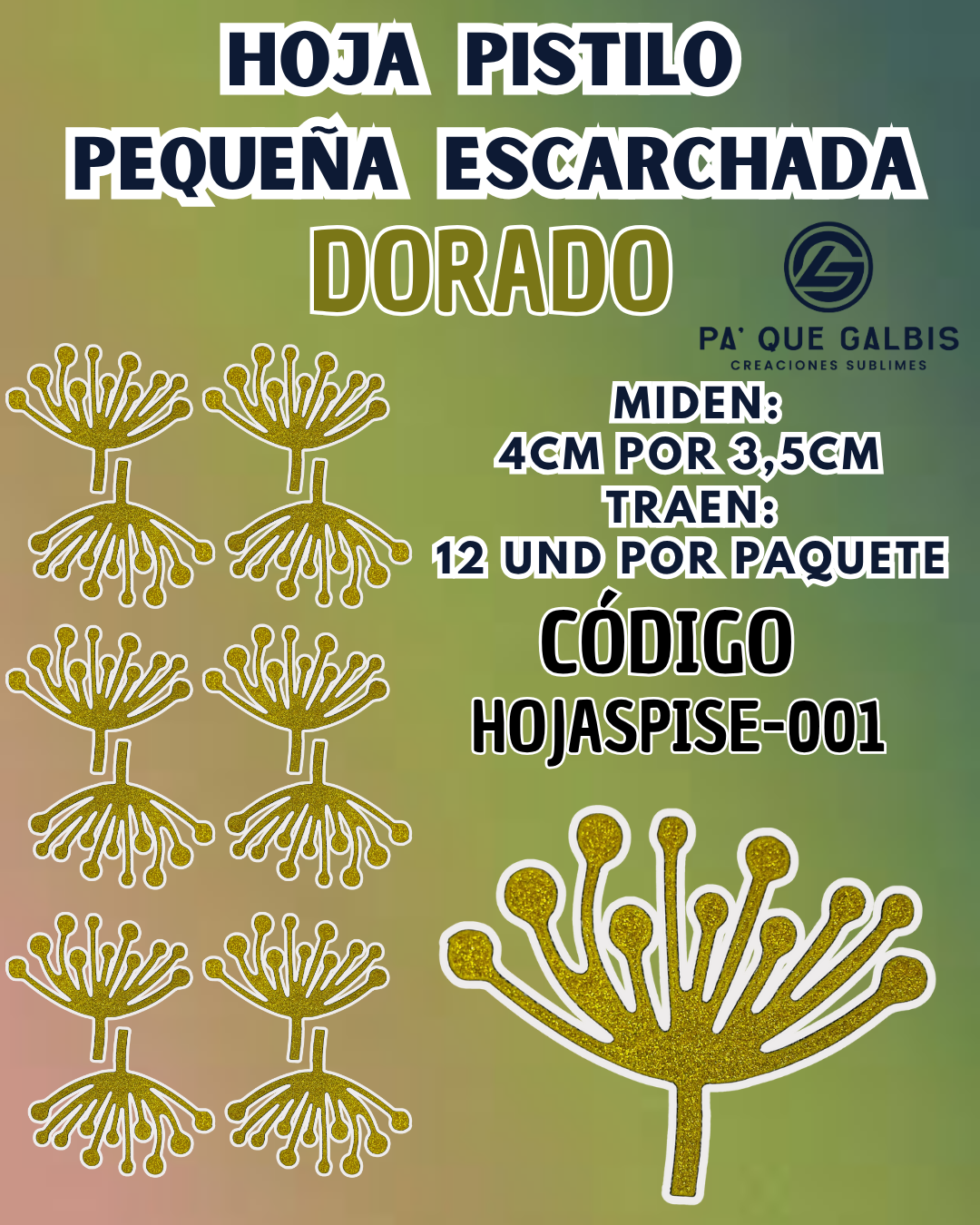 HOJAS PEQUEÑAS PISTILO DORADO ESCARCHADAS 1 PAQUETE CONTIENE 12 UND CÓDIGO HOJASPISE-001
