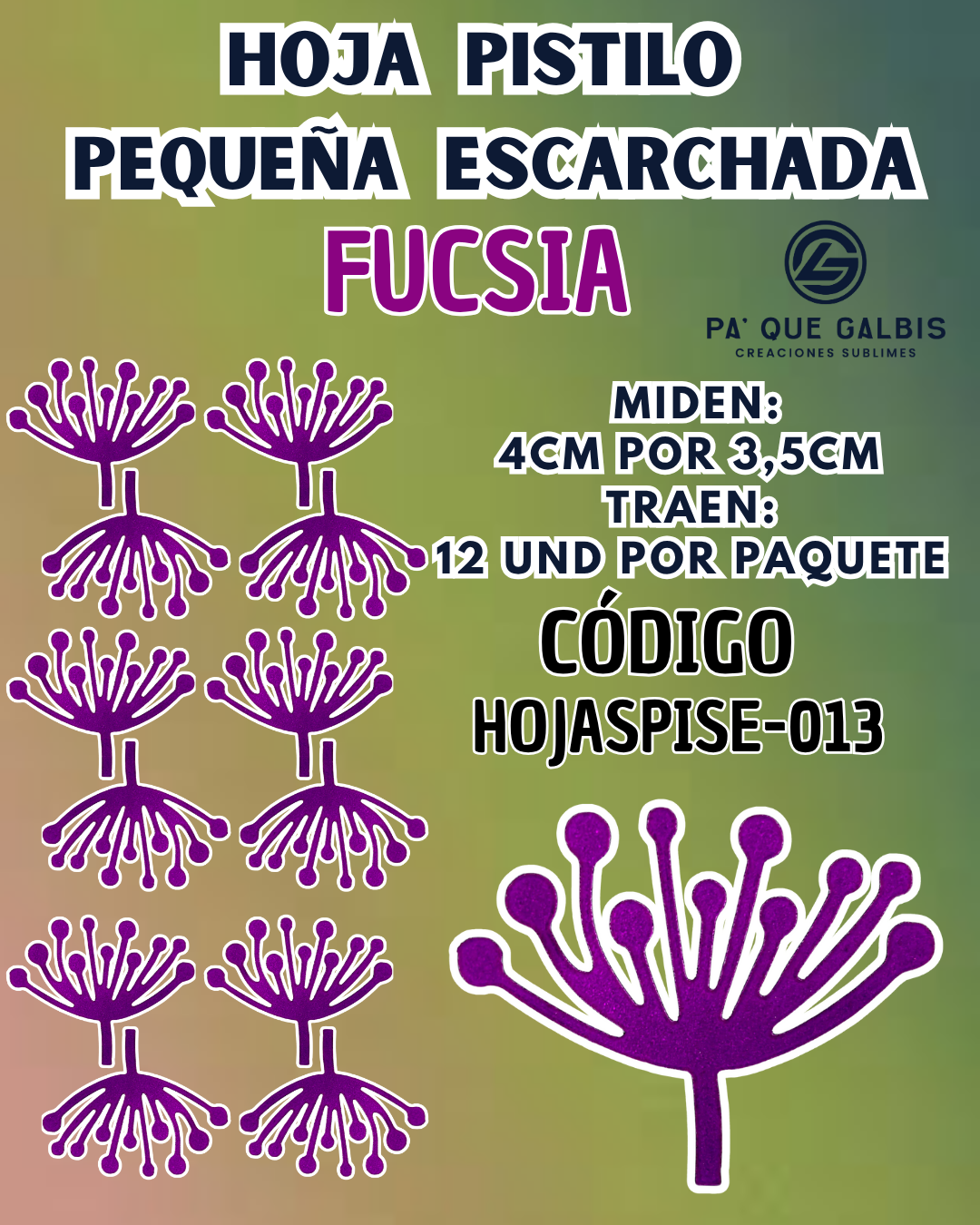 HOJAS PEQUEÑAS PISTILO FUCSIA ESCARCHADAS 1 PAQUETE CONTIENE 12 UND CÓDIGO HOJASPISE-013