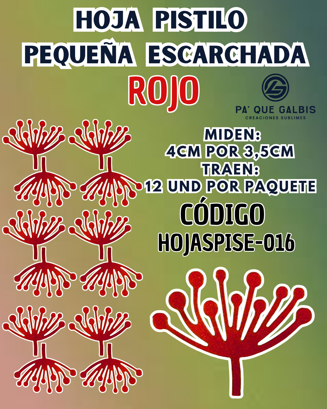 HOJAS PEQUEÑAS PISTILO ROJO ESCARCHADAS 1 PAQUETE CONTIENE 12 UND CÓDIGO HOJASPISE-016