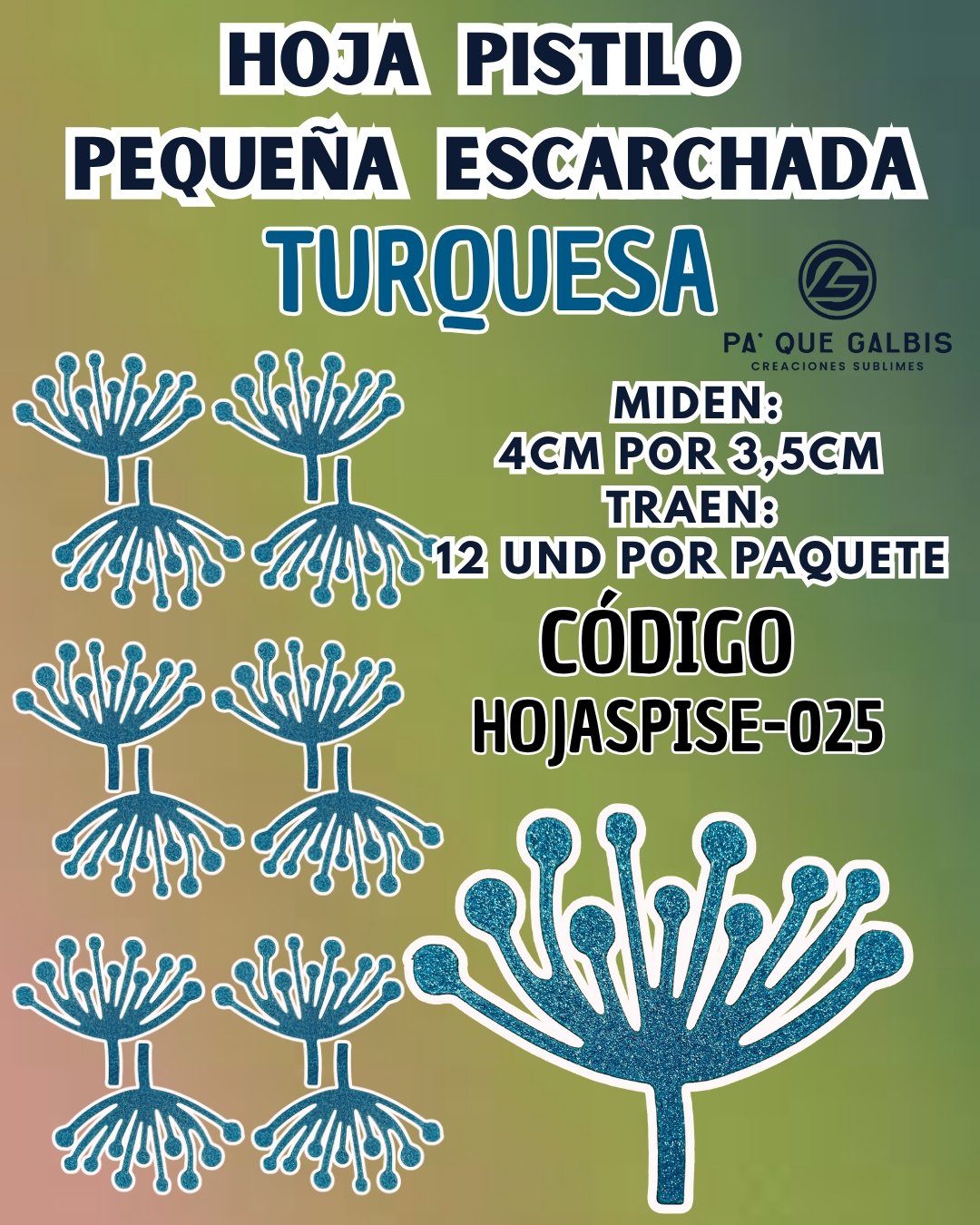HOJAS PEQUEÑAS PISTILO TURQUESA ESCARCHADAS 1 PAQUETE CONTIENE 12 UND CÓDIGO HOJASPISE-028