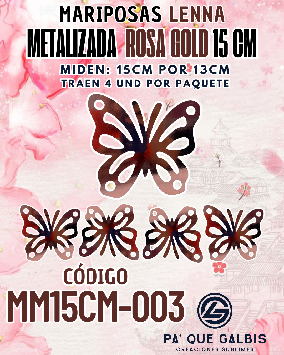 Mariposas 15 cm Lenna Rosa Gold metalizadas 1 paquete contiene 4 und. código MM15CM-003