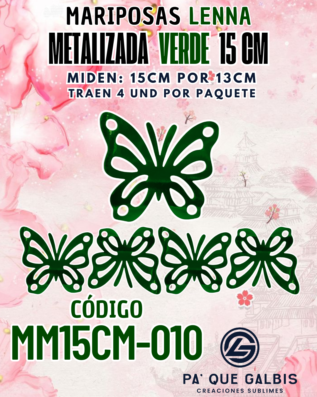 Mariposas 15 cm Lenna Verde metalizadas 1 paquete contiene 4 und. código MM15CM-010
