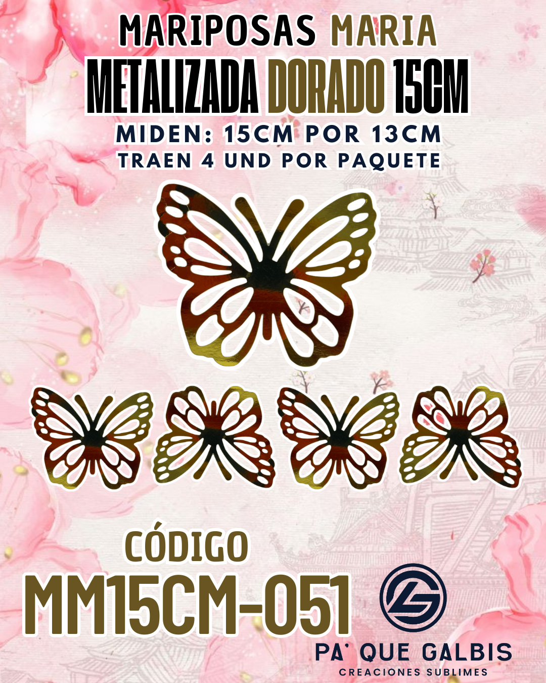 Mariposas 15 cm Maria Dorado metalizadas 1 paquete contiene 4 und. código MM15CM-051