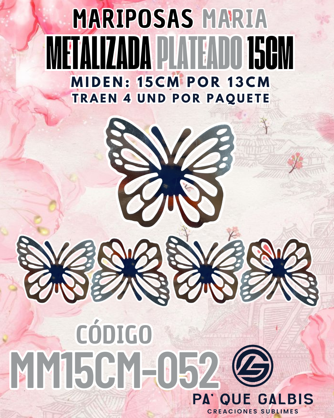 Mariposas 15 cm Maria Plateado metalizadas 1 paquete contiene 4 und. código MM15CM-052