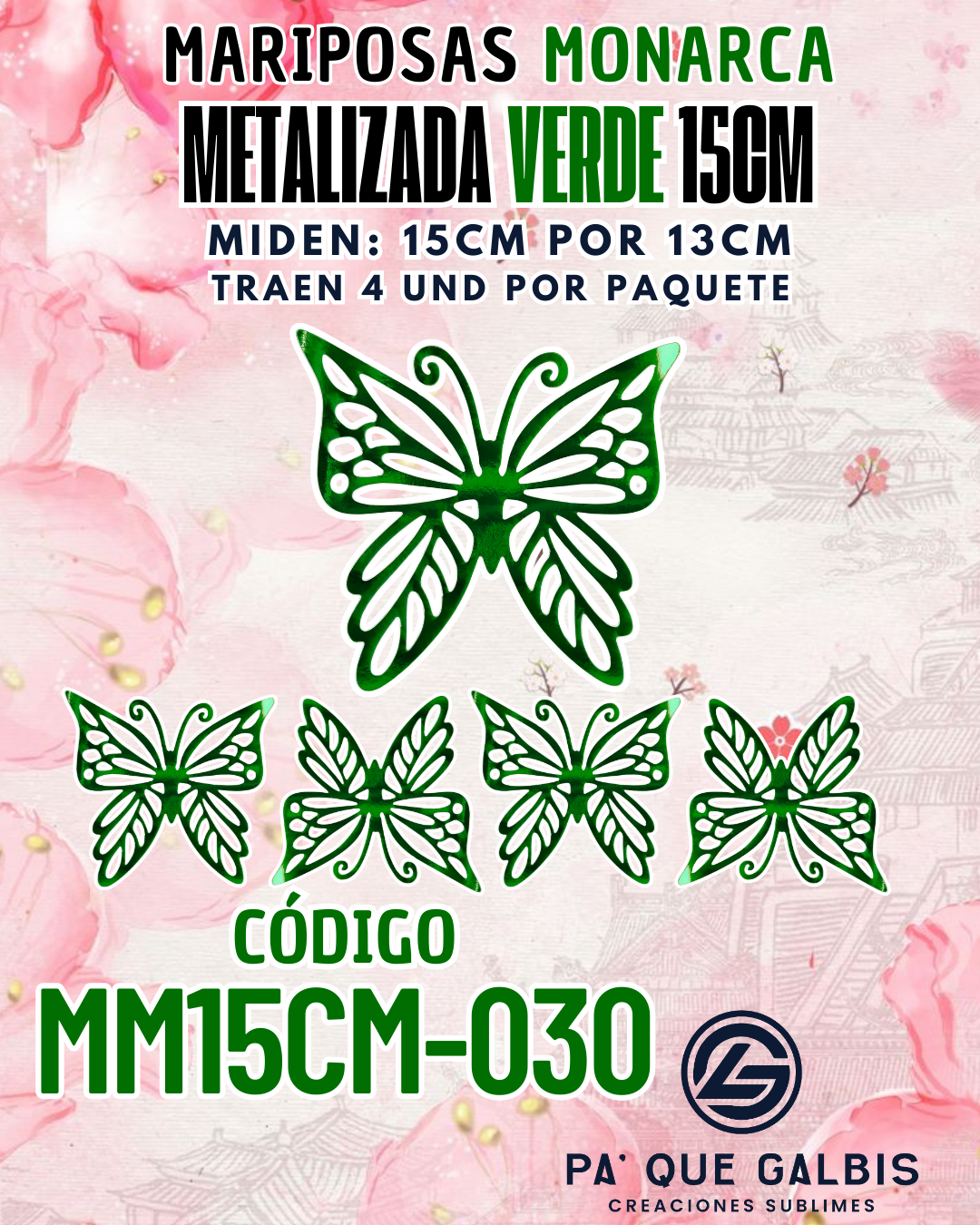 Mariposas 15 cm Monarca Verde metalizadas 1 paquete contiene 4 und. código MM15CM-030