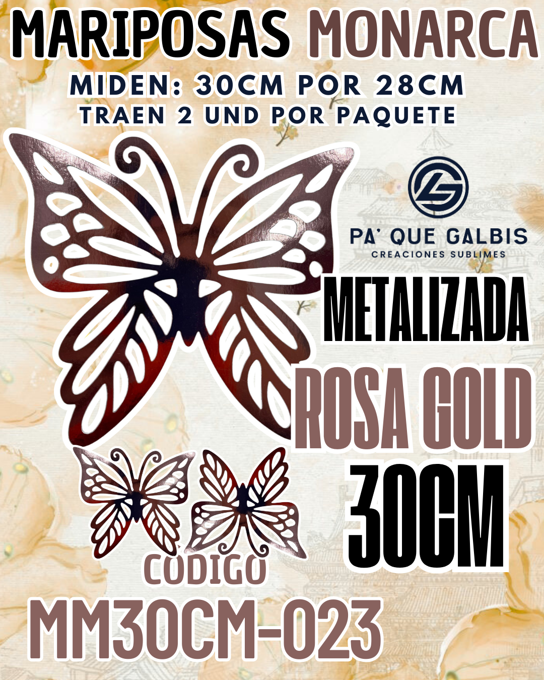 Mariposas 30 Cm Monarca Rosa Gold metalizadas 1 paquete contiene 2 und. código MM30CM-023
