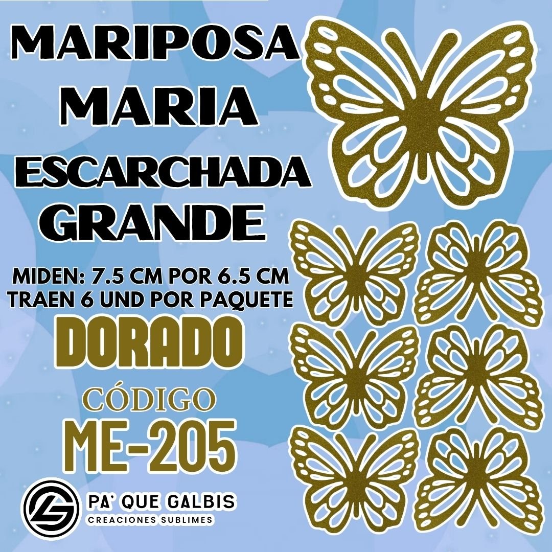 Mariposas Grandes Maria Dorado Escarchada 1 paquete contiene 6 und. código ME-205