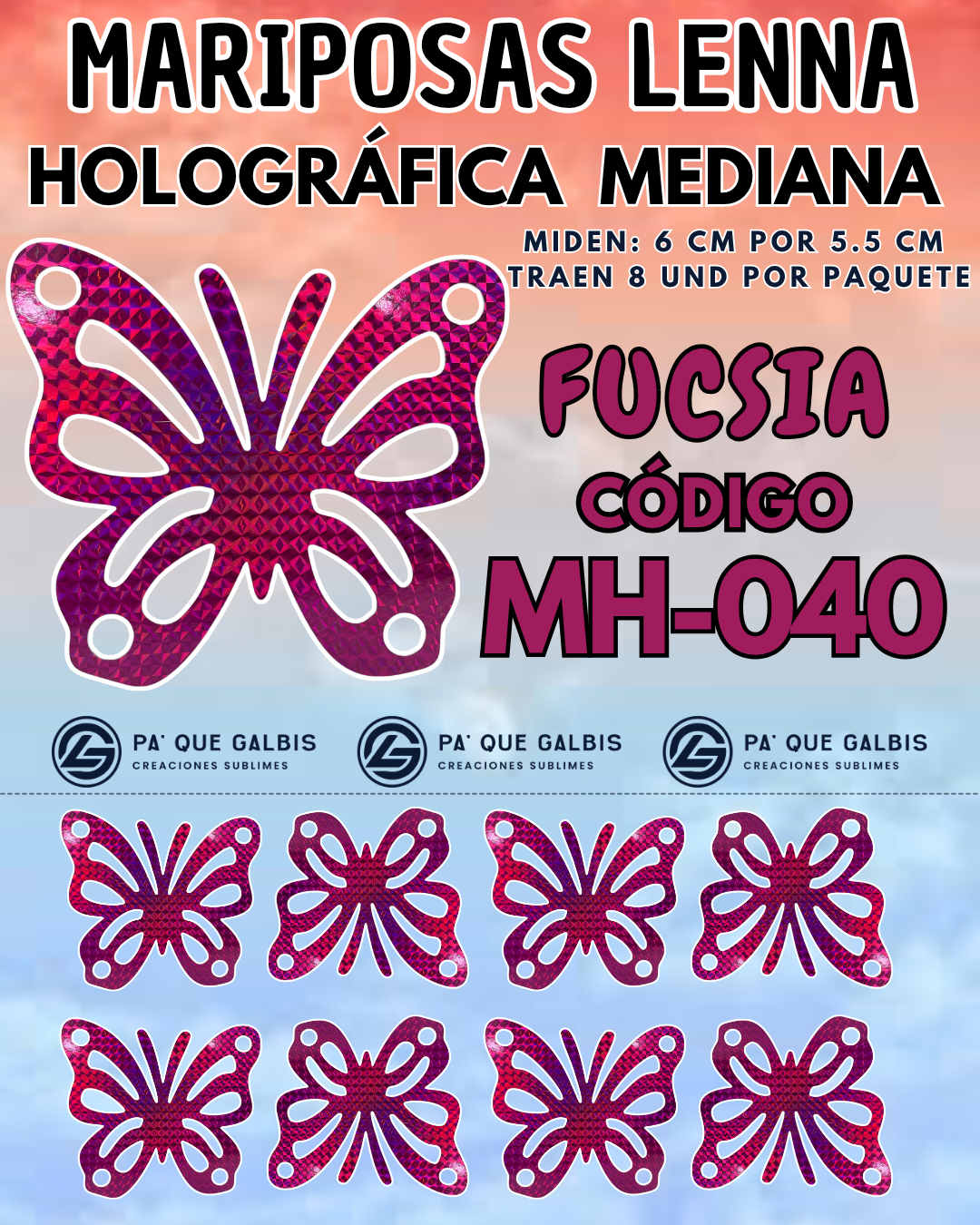 Mariposas Medianas Lenna Fuscia Holográfica 1 paquete contiene 8und. código MH-040