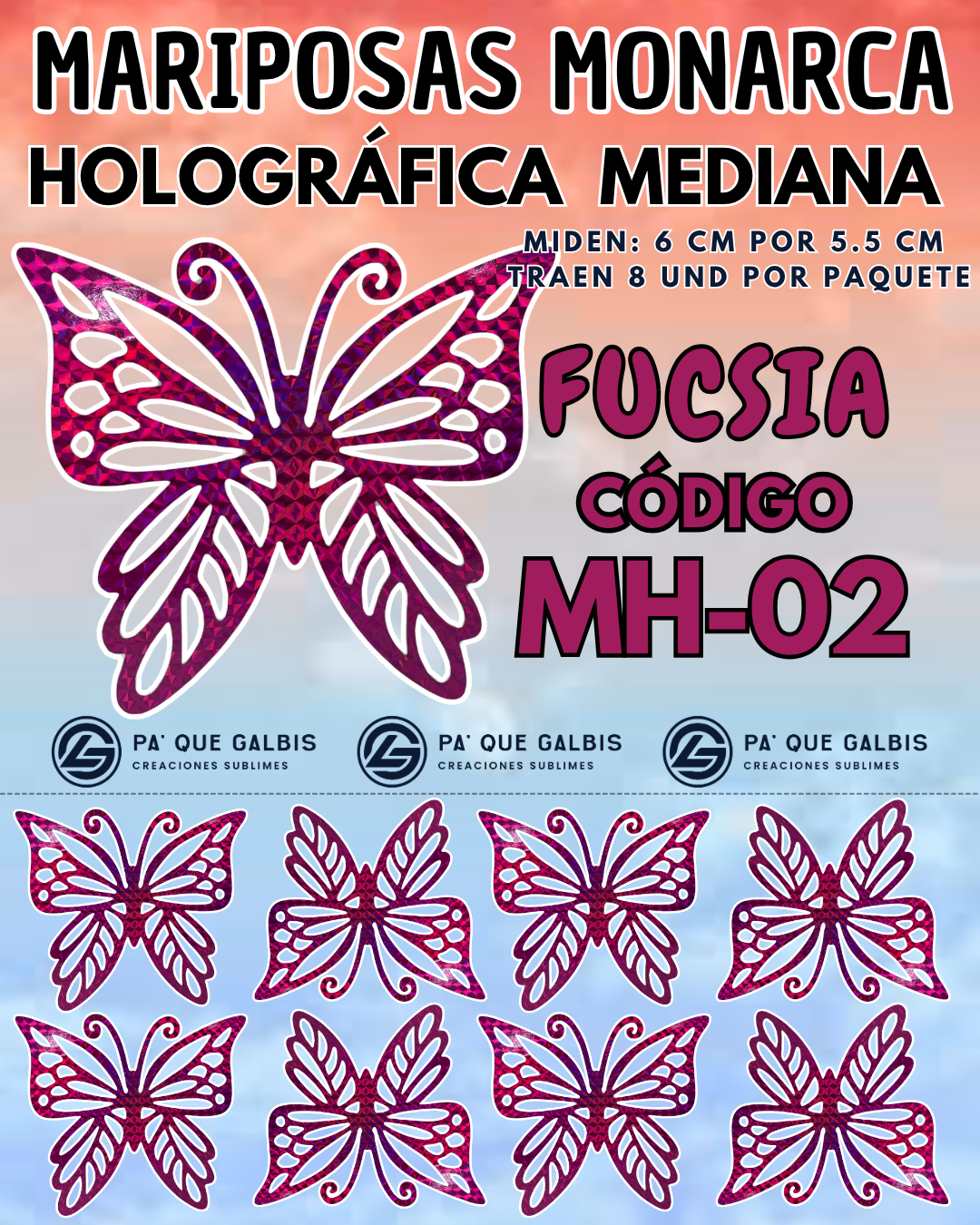 Mariposas Medianas Monarca Fuscia Holográfica 1 paquete contiene 8und. código MH-052