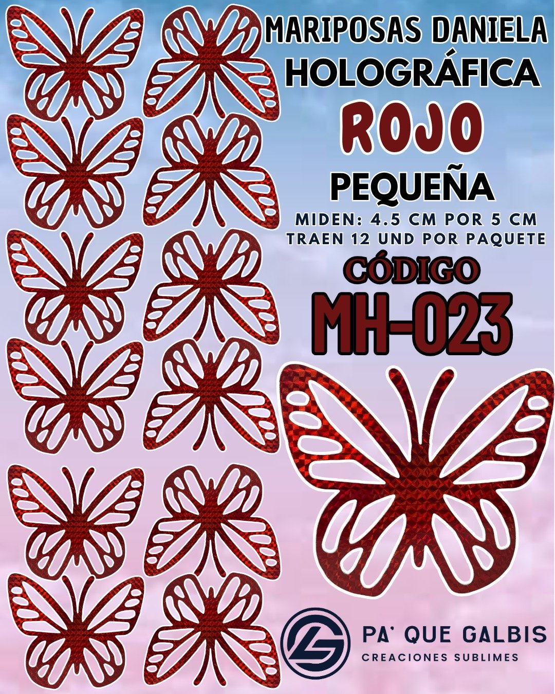 Mariposas Pequeñas Daniela Rojo Holográfica 1 paquete contiene 12 und. código MH-023