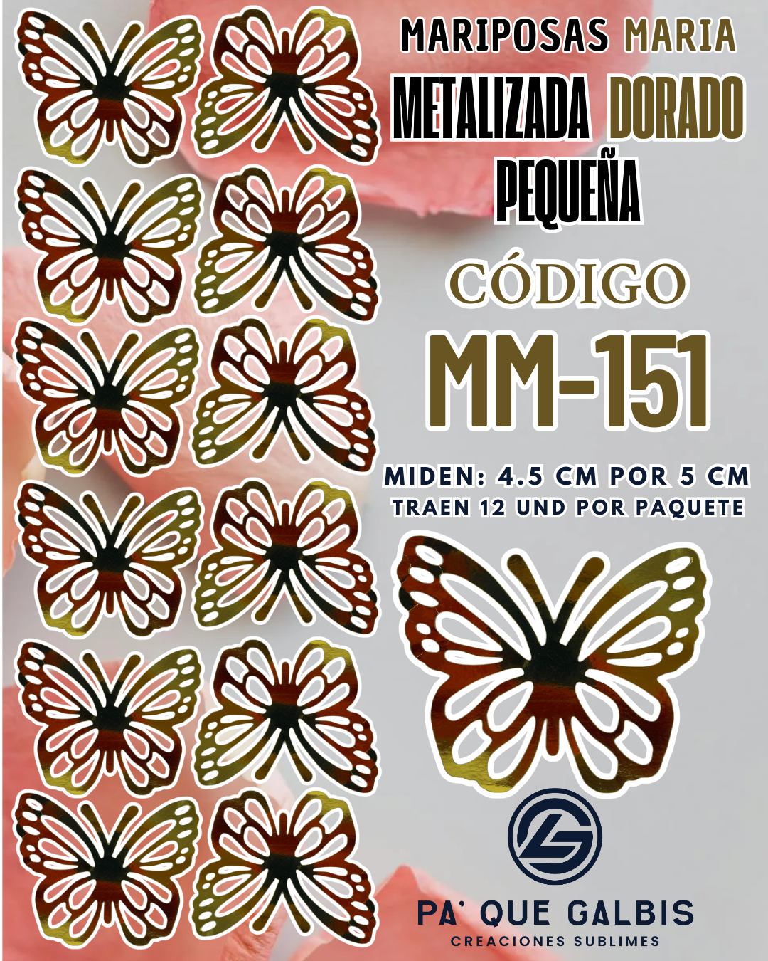 Mariposas pequeñas Maria Dorado metalizadas 1 paquete contiene 12 und. código MM-151