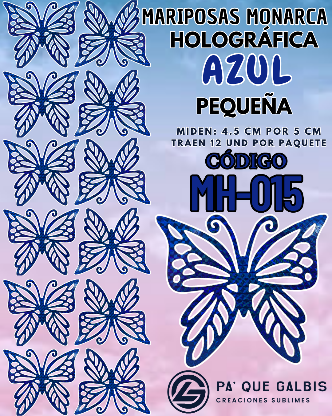 Mariposas Pequeñas Monarca Azul Holográfica 1 paquete contiene 12 und. código MH-015