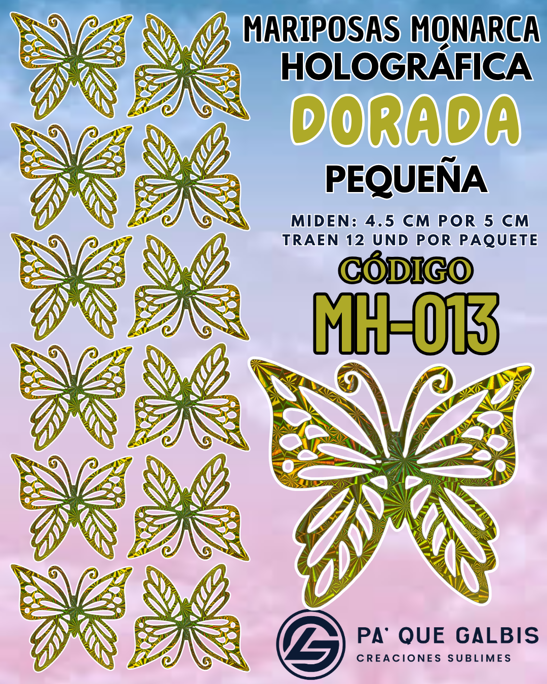 Mariposas Pequeñas Monarca Dorada Holográfica 1 paquete contiene 12 und. código MH-013